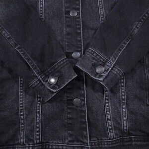 Women's American Eagle oversized black denim jean jacket with embroidered red flowers or roses. Has fading throughout as shown in photos, otherwise in good used condition. Women's size XS or extra small, real measurements shown in photos with jacket laid flat: