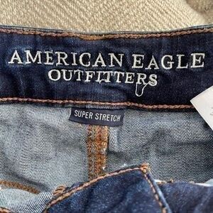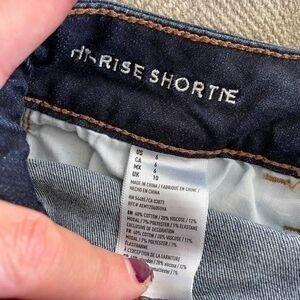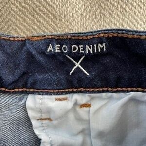American eagle dark blue zip fly high rise cuffed denim jeans shorts. Measurements are approximate and taken while laying flat: 9.5 inch rise, 13.5 inches straight across the waist and 2.75 inch inseam