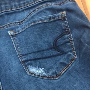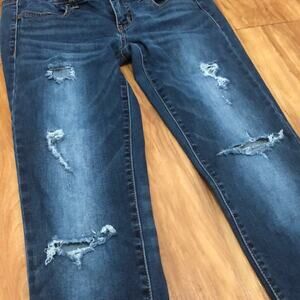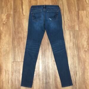 • Other information: Dark wash denim jeggings with intentional distressing.