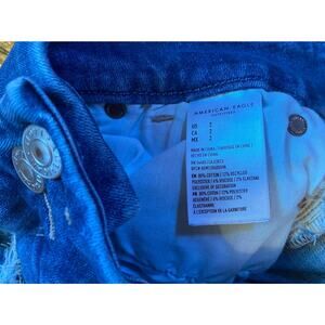 The product is a pair of American Eagle Distressed Denim Jeans Shorts in a women's size 2. These shorts feature a next level stretch for added comfort and flexibility. The denim fabric is in a classic blue color and has a cut-off style, making them a stylish and versatile addition to any summer wardrobe. With the American Eagle brand known for quality and trendy designs, these shorts are sure to be a favorite for any fashion-forward woman.