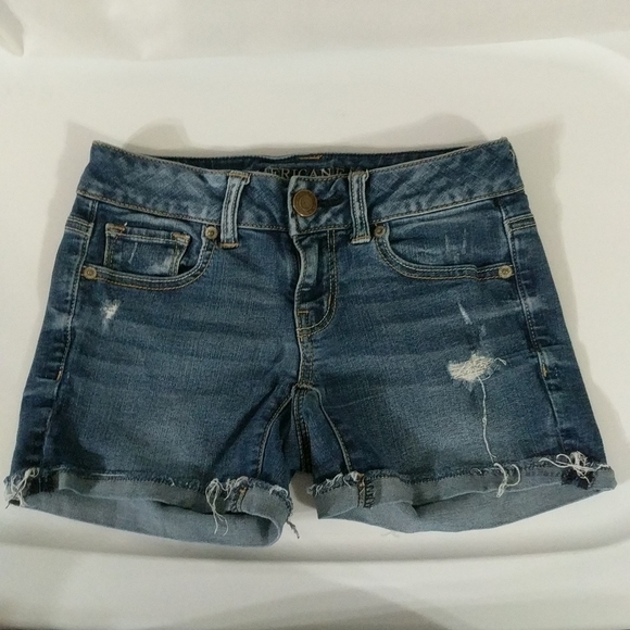 American Eagle Distressed Denim Super Stretch Medium Wash Shorts - size 0. Gently used condition.