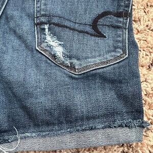 American Eagle High Rise Shortie Shorts. Classic 5-pocket blue jean denim distressed raw hem cutoffs. Pre-owned in very good condition, no holes or stains.