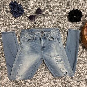American Eagle super stretch jeans. Complimented by a distressed style. Single button closure followed with a functional zip closure. Original tag attached. Care Instructions attached. Made in China.