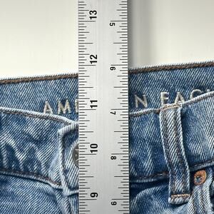 These American Eagle shorts are a stylish addition to your summer wardrobe. Made from a comfortable blend of 92 cotton, 7 recycled cotton, and 1 elastane, they offer both durability and a bit of stretch for comfort. The light blue denim features a distressed design with rips and frayed edges, giving them a trendy, casual look. Perfect for warm weather outings, these shorts are versatile enough to pair with a variety of tops. See measurements in photos. Measurements (approximate): Waist: 30 Inseam: 3