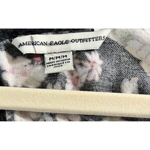 This is an American Eagle black floral dress in size M with long ruffle balloon sleeves. The whimsical bohochic style features a V-neck with ties at the neckline, a high waist, and a double layer of elastic at the arms/wrists. The dress is made of viscose fabric with a rayon construction, suitable for machine washing. It is ideal for occasions like weddings, parties, or casual wear in winter, fall, or spring, resonating a flower theme.
