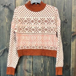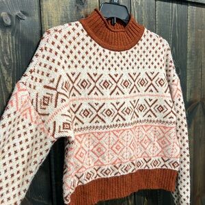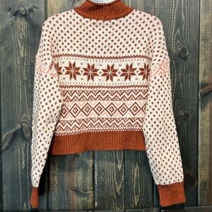Retro style AEO brand Fair Isle crop sweater. Size small. Slightly oversized. Long sleeves. Chunky knit. Mock rolled turtleneck. Cozy. Brick brown / red (brownish red) & cream. Fair Isle design. Stretch material. Great for fall & winter. Y2K vibes! Preloved. Please see all photos for condition.