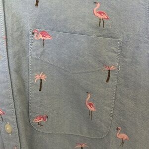 Fun Blue Button Down Pink Flamingo and Palm tree shirt from