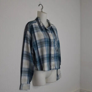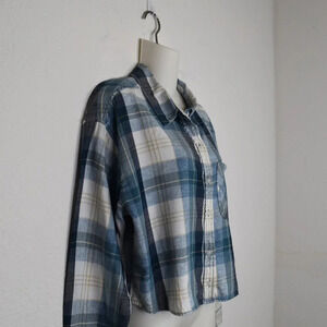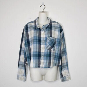 Pre-owned, good condition. No visible holes or stains. Plaid flannel in various shades of blue, white and yellow. Button down. Cropped. Long sleeves with button cuffs. Collared. Oversized fit. Boxy. Large patch chest pocket. Size per tag: M (Medium). Fabric: 100% Cotton. Made in Indonesia. Size per tag does not guarantee desired fit, please see pictures for measurements.