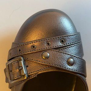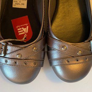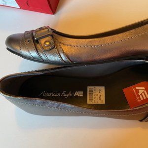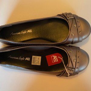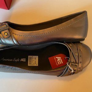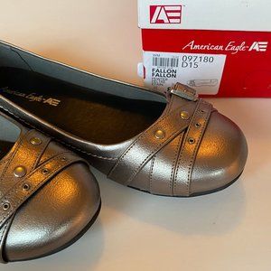 New, with tags and box. American Eagle 'Fallon' flat in pewter/silver/gray. Size 8M.