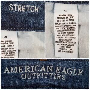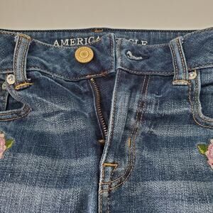 American Eagle Outfitters (AEO) floral embroidered cut off denim stretch shorts, size 4. Frayed hem. Shorts feature floral embroidery on the front left and right sides of the shorts. Shorts zip and have a button fly closure. Boho. Festival.