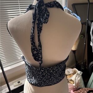 Stylish halter top with a floral pattern. Features a deep V-neck design.