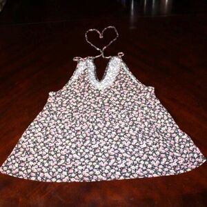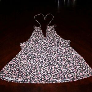 Feminine and flowy, this American Eagle floral peplum tank top is perfect for casual days or festival vibes! Features a soft, lightweight 97% viscose / 3% elastane blend for a comfy, breathable feel. The dainty pink and white floral print pops against the black background, giving a sweet cottagecore & boho aesthetic.