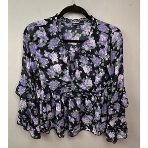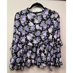 American Eagle Floral Ruffle Top Womens Small Black Purple Sheer Feminine