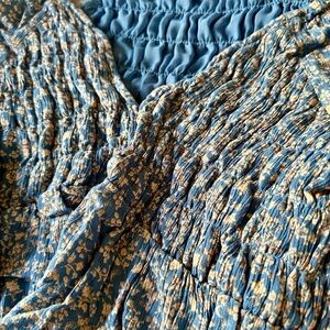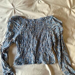 Chic blue blouse with floral pattern. Features a flattering V-neck and long sleeves. Ideal for casual outings.