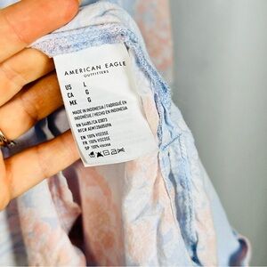 Softly romantic and effortlessly chic, this American Eagle button-down shirt channels an easy cottagecore aesthetic with its pastel blue base and peach floral print. Made from 100% viscose, it drapes beautifully with a lightweight, breezy feel—perfect for layering or wearing on its own. Features tortoise-style buttons, a front pocket, curved hem, and relaxed, flowy silhouette.