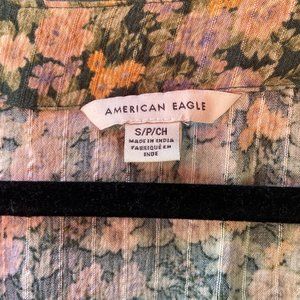 Hunter green paired with soft blue, pink and yellow offer a vintage look to this long sleeve blouse.