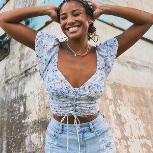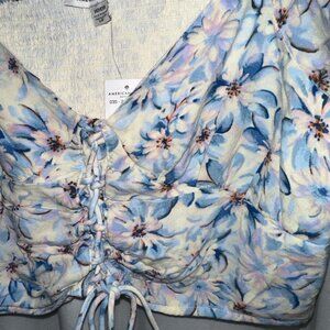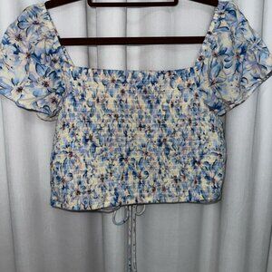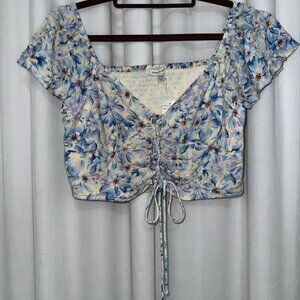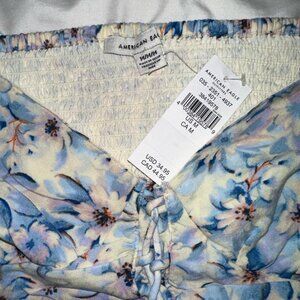 American Eagle Flutter-Sleeve Corset Blouse Size M Blue/Cream/Floral