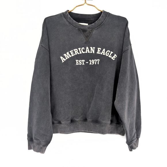 American Eagle Women's Men's Unisex Dark Gray/Grey Oversized Distressed Crewneck Embroidered Soft Fleece AE Funday Sweatshirt / Long Sleeve Top - Size M - NEW