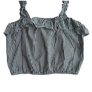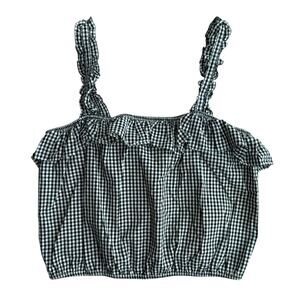 Features ruffle shoulder straps, soft gingham print, and an easy cropped silhouette. Ideal for cottagecore, coquette, or vintage-inspired outfits.