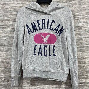 This American Eagle hoodie offers a blend of casual comfort and style. With a soft gray fabric, it features a bold pink and navy graphic logo on the front. The hood and long sleeves provide extra warmth, making it ideal for cooler days. A versatile piece for layering or wearing alone.
