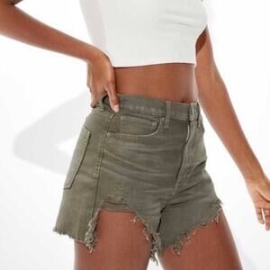 Size 2 American Eagle Highest Rise Mom Shorts. Intentional distressing and fraying. Five pockets. Lightweight, stretch denim in green. Zipper fly. Great condition!