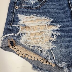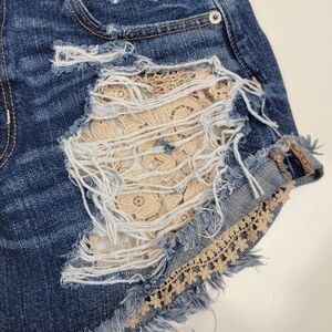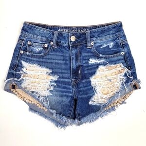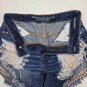 American Eagle Hi Rise Festival Distressed Denim Shorts. Size 4. Off white/beige floral lace detail pockets. High rise.