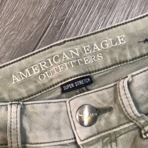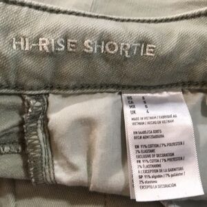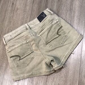 American Eagle “Hi-Rise Shortie” Light Olive Green Distressed Denim Shorts