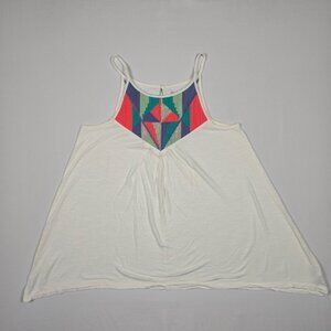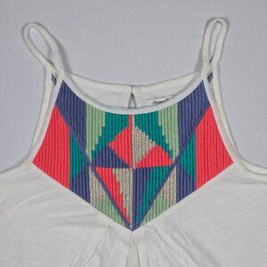 American Eagle Outfitters sleeveless tunic top in ivory with colorful geometric embroidery in red, green, blue, and grey. Soft and lightweight viscose fabric. Can be styled as a tunic or short dress.