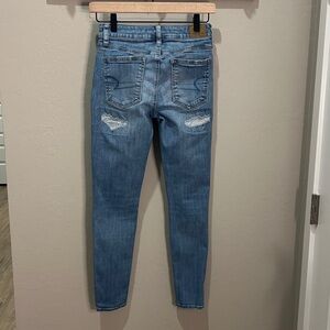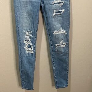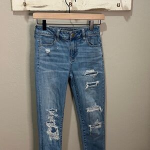 American Eagle jeans. Size 0 short. See pics for measurements. Light blue distressed hi rise jegging. These are the ones that have patches sewn in underneath so they don’t show any skin.