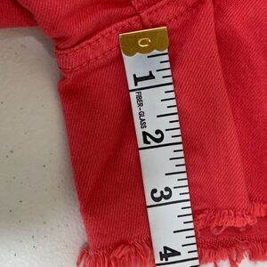 A raspberry pink colored jean shorts. Mid rise. Midi length. Tie dye accent. Frayed hem. Fabric has stretch.
