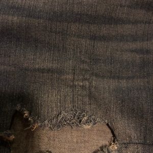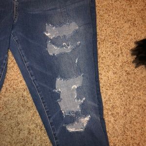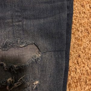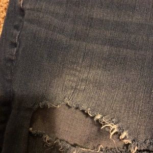 Distressed jeans from American Eagle. Very stretchy comfortable material. High waisted. There are signs of wear on part of the distressing. All flaws are pictured. In my opinion, they are not incredibly noticeable when you wear them because they are already so distressed.