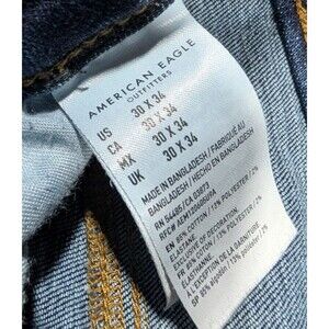 The American Eagle Men's 30x34 (Fits 30x31) Blue Next Level Flex Slim Straight Jeans are made of denim with a low rise and a slim fit. They feature a zip closure, button accents, and a 5-pocket design. These jeans also have a stretch fabric for added comfort and flexibility. The solid blue color and modern design make them a versatile option for all seasons, while the American Eagle branding adds a touch of style. Perfect for everyday wear, these jeans are easy to care for with machine washable instructions. A5 0481