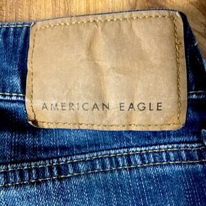 The product is a pair of American Eagle men's jeans in a relaxed straight fit, featuring a dark wash denim fabric with whiskering. These jeans have a solid blue color made from cotton denim material. They have a zip closure, a low rise of 8-10 inches, and a 5-pocket design with the brand logo as accents. With a waist size of 31 inches and an inseam of 30 inches, these jeans are machine washable and suitable for all seasons. Made in Bangladesh, this pair of American Eagle jeans is designed for regular sizing in men's fashion.