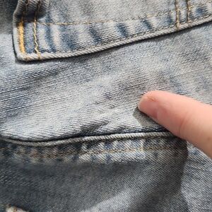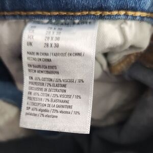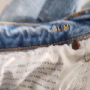 These stylish blue jeans from American Eagle Outfitters boast a chic ankle-cropped design, ideal for highlighting your favorite shoes. The denim features a vintage-inspired faded look with subtle whiskering, adding a touch of character to your everyday style. Enjoy the comfortable fit and modern appeal of these versatile jeans size 28 ankle jeans some flaws puckering on butt flipped pockets light wash slim next level flex