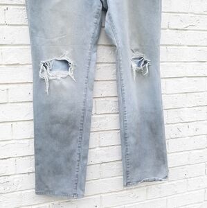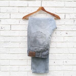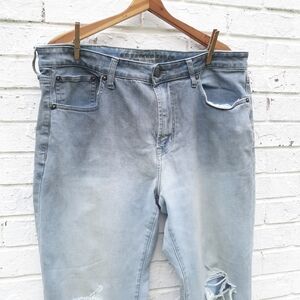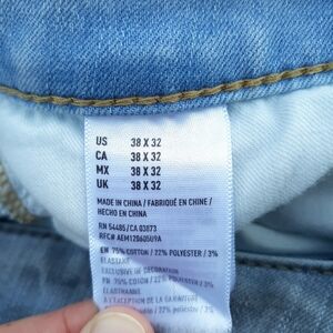 Very good Distressed condition, Mens size 38x32. Lightwash with Gray faded areas, please see all photos. Approximate flat lay measurements Waist 18.5 inches, Inseam 31 inches.