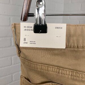 These American Eagle Outfitters women's jeggings in light brown are a size 8, made from comfortable, stretchy cotton. The high-rise, skinny fit offers a flattering silhouette.