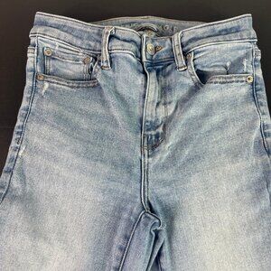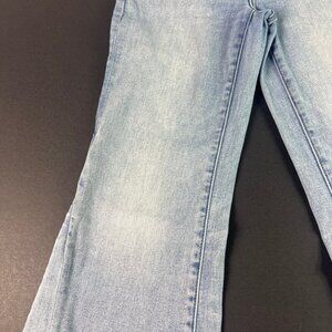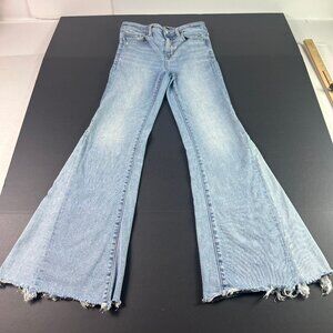 You are purchasing American Eagle Jeans Women's Measured 27 x 29.5* Festival Flare Mid Rise Light Blue Faded Raw Hem Stretch Denim Tagged 4 Regular
