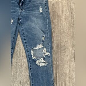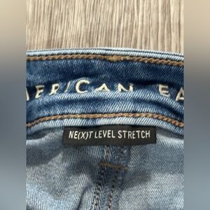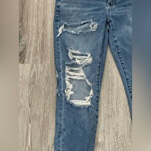 Stylish distressed blue jeans with a trendy look. American Eagle