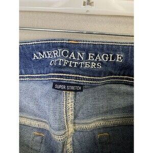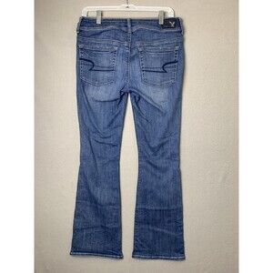 The product is a pair of American Eagle Women's Jeans in size 8, featuring a bootcut style with a super stretch denim fabric. These jeans are in a classic blue color with a solid pattern, accented with button and zipper closures. Machine washable and made of a comfortable cotton blend material, these jeans are designed with a regular fit for a comfortable and flattering look. With features like shaping, comfort, and pockets, these jeans are suitable for all seasons and can be styled for various occasions, making them a versatile and stylish addition to any woman's wardrobe.