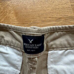 American Eagle khaki midi shorts. Stock photo provided for style and fit reference. Kind of a tan/khaki color! Color photographed a little light in some of the photos but it shows better in the close up photos of the tags. Size 10. In great used condition with no flaws that I could find! 97% cotton, 3% elastane.