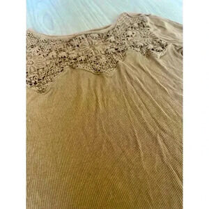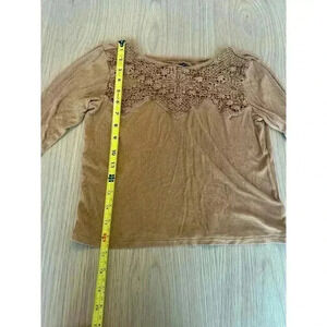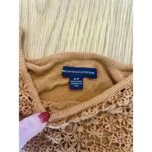 Good condition American Eagle Crop Top. Size Small. Half length sleeves. Lace design at neckline. Burnt orange brown color.