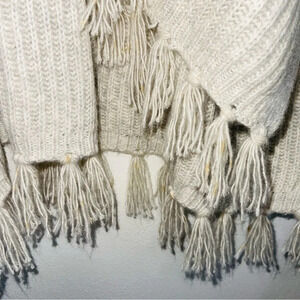 American Eagle light gray knit tassel fringe hem poncho sweater. In excellent condition! Open front. Wide kimono style sleeves. Tassel fringe bottom hem. Chunky knit material. Light gray color. One size fits most.