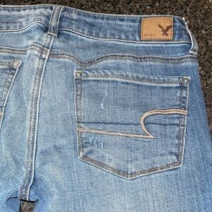American Eagle light wash distressed skinny stretch jeans. 5 pocket detail. Size 6 Short. 15” waist across top laid flat. 7 1/2” rise. 28” inseam. Pre-owned.