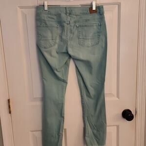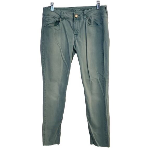 Gently preowned light blue jeans by American Eagle. Raw edge.