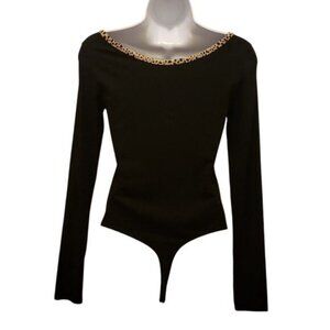 American Eagle Long Sleeve Bodysuit Size Small Black Leopard Print Trim Stretch