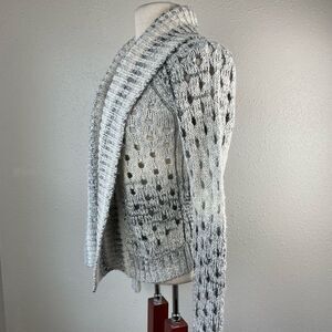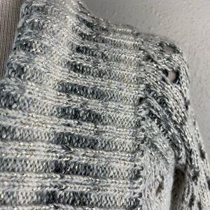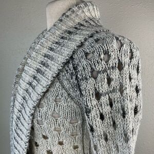Super cute cardigan featuring a large loose knit design and silver metallic threading throughout. It measures 16 inches armpit to armpit laying flat and 24 inches in length from shoulder to hem.