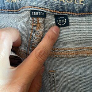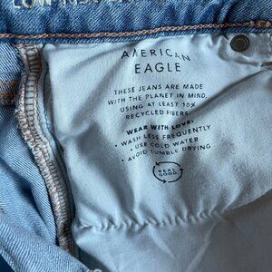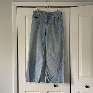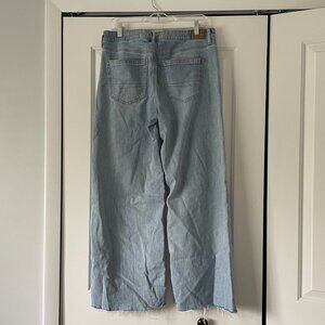Super-soft, light blue, stretchy wide-leg AE jeans with raw hem. No flaws.