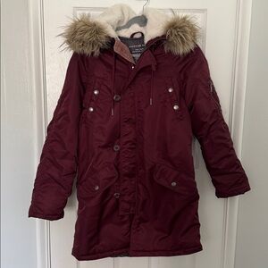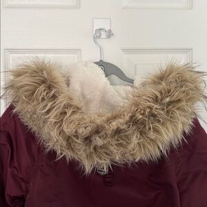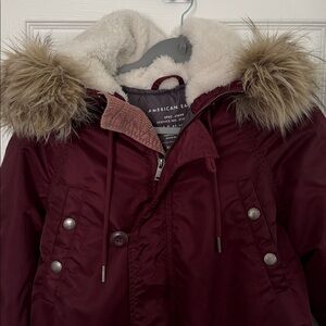 American Eagle Maroon Parka Coat, Removable Fur Sherpa Hood EUC Above knee