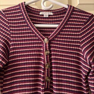 Colors are maroon with hints of black, cream, orange, and brown stripes. 4 tortoise buttons at neckline.