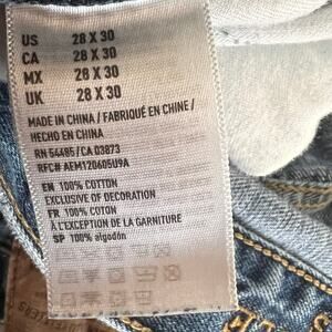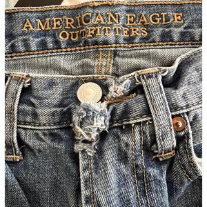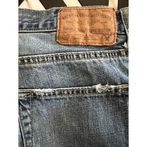 Men’s American Eagle jeans in size 28x30 with a timeless straight leg fit. Medium blue denim with a worn-in look. Ripped buttonhole shown in photos — still wearable or perfect for a DIY denim project or casual style.